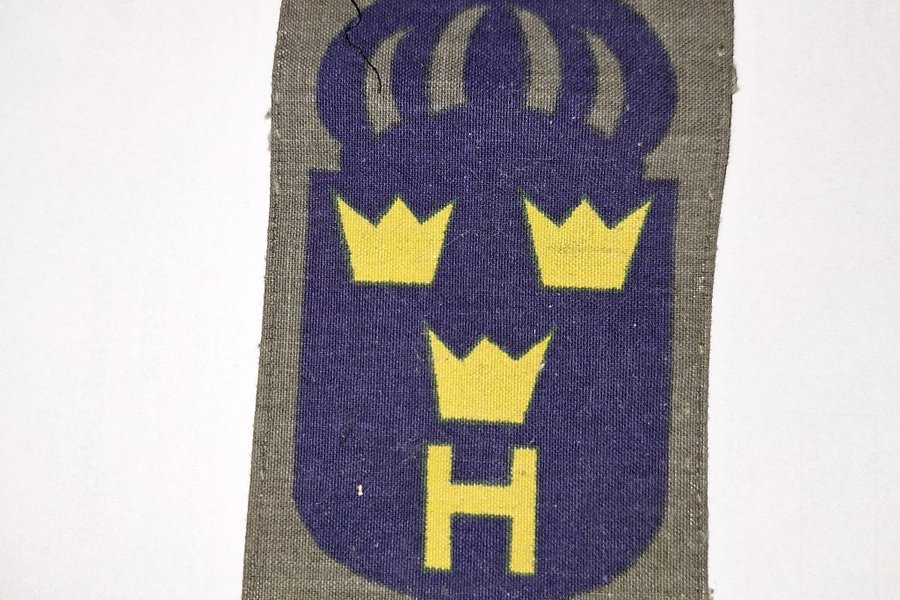 Ett tygmärke med en stiliserad vapensköld. Vapenskölden är blå med tre gula kronor och ett gult "H" under den nedersta kronan. Ovanpå skölden finns en större blå krona. Märket har en grå bakgrund.