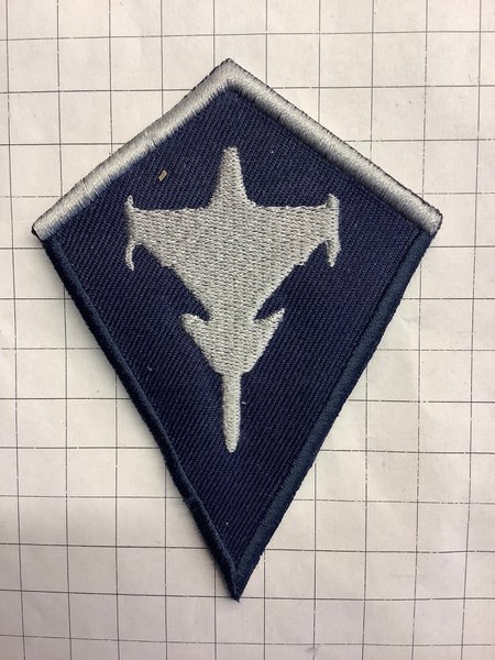 Ett broderat tygmärke i form av en romb. Märket har en mörkblå bakgrund med en silverfärgad kontur och ett silverfärgat motiv av ett flygplan i mitten. Obs replika.