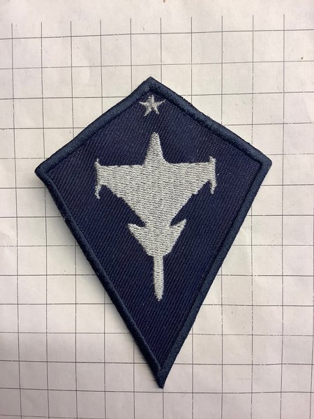 Broderad tygmärke med ett flygplan och en stjärna på en mörkblå bakgrund. Märket är format som en romb. Obs replika.