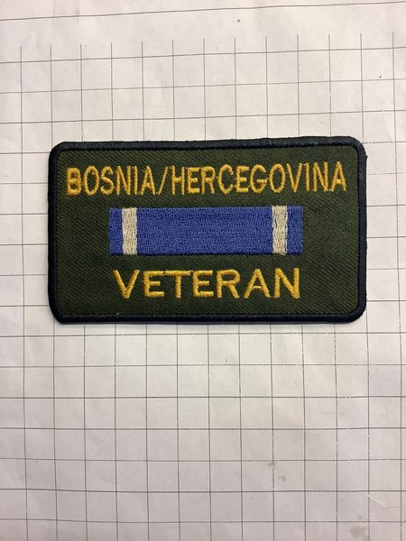Broderad tygmärke med texten "BOSNIA/HERCEGOVINA VETERAN" i guld. Märket har en grön bakgrund och en blå/vit rand i mitten.