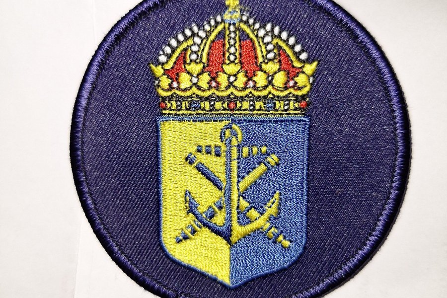 Broderad tygmärke med marint motiv. Märket är runt med en mörkblå bakgrund. I mitten finns en vapensköld med en krona ovanpå. Vapenskölden är delad i gult och blått med ett ankare och två korslagda föremål.