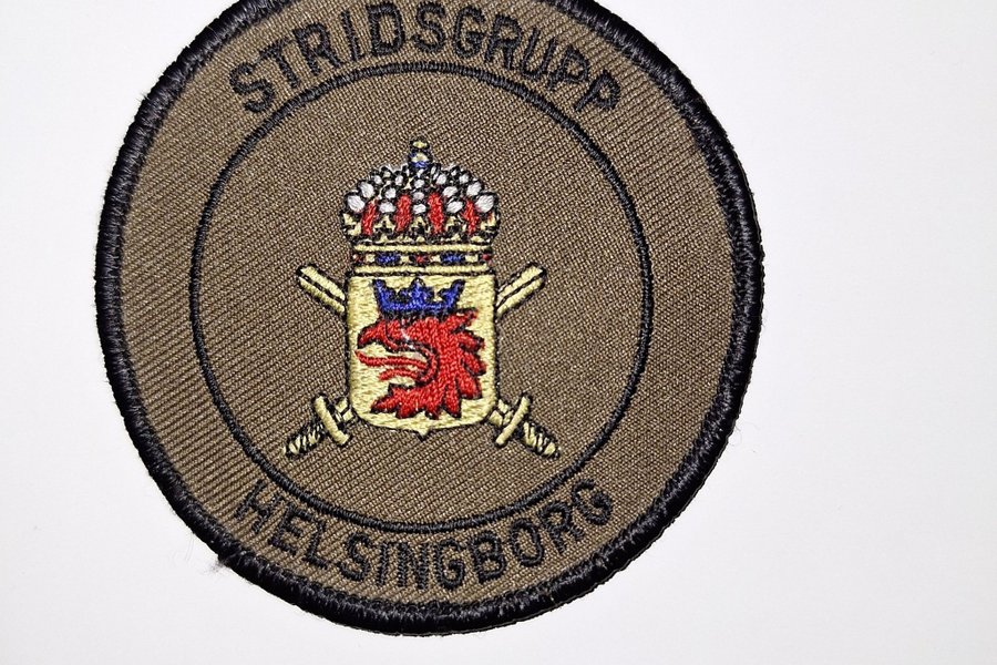 En broderad tygmärke med texten "STRIDSGRUPP HELSINGBORG" och ett vapen med en krona och korslagda svärd.