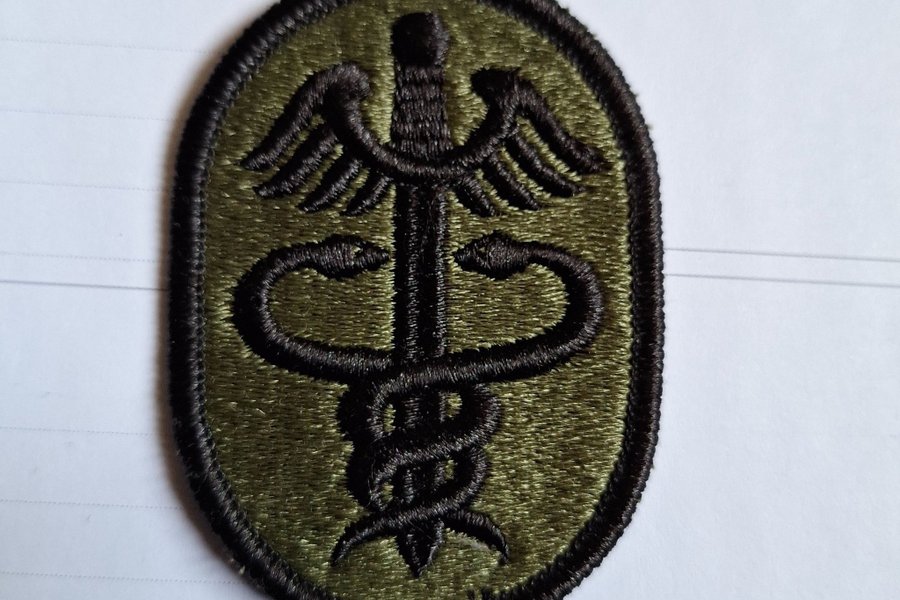 Broderad tygmärke med en medicinsk symbol i svart mot en olivgrön bakgrund. Märket har en oval form med en svart kant.