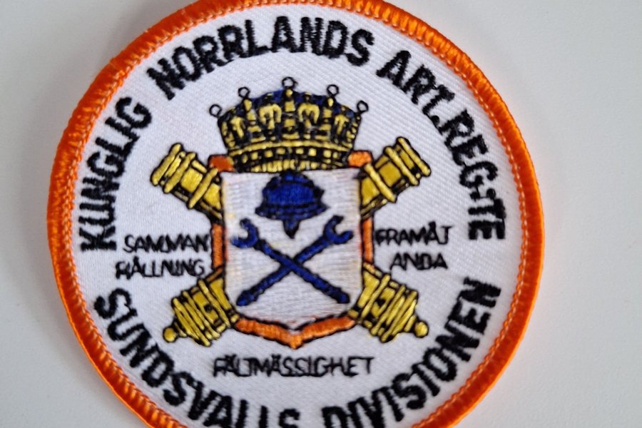 En broderad tygmärke som representerar Kungliga Norrlands Artilleriregemente Sundsvallsdivisionen. Märket har en vit bakgrund med en orange kant och visar en vapensköld med en krona, kanoner och verktyg.