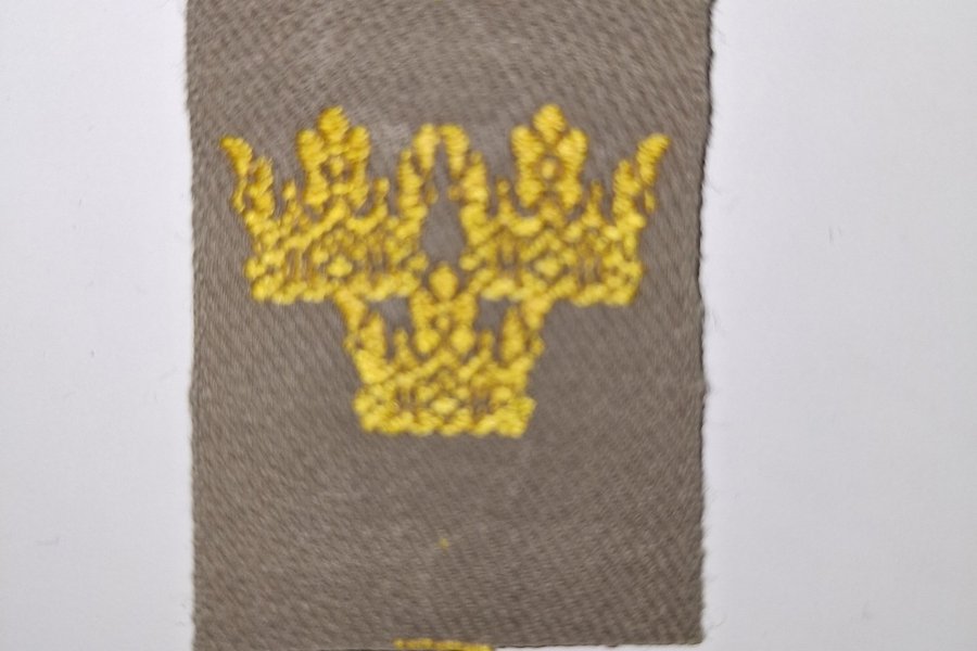 Ett tygmärke med en broderad guldkrona på en grå bakgrund. Märket har en rektangulär form.