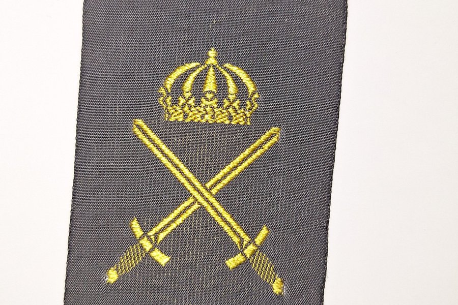 Märke med broderad krona och korslagda svärd i guldtråd mot en mörkblå bakgrund. Perfekt för att dekorera eller samla.