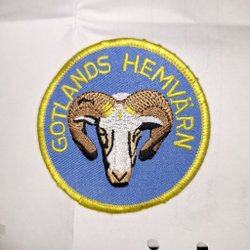 Blekinge Flygflottilj F 17 tygmärke med broderad design. Märket har en vit bakgrund med en blå kant och texten "BLEKINGE FLYGFLOTTILJ F 17" broderad i svart. I mitten finns en vapensköld med en krona.