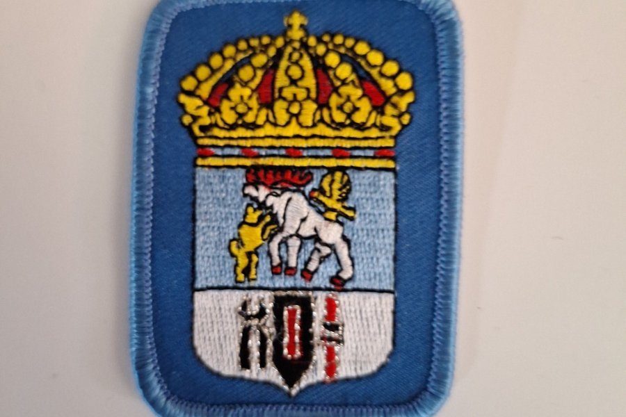 Broderad tygmärke med ett vapenmotiv. Märket har en blå bakgrund med en guldkrona högst upp. Under kronan finns en vit häst och ett vapensköld.