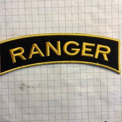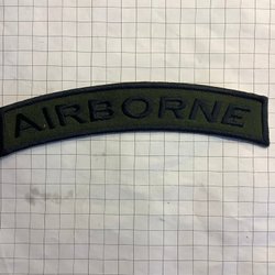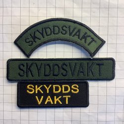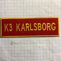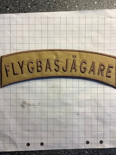 Märke med texten "FLYGBASJÄGARE" broderad i brunt på en beige bakgrund. Märket är format som en båge och har en broderad kant.