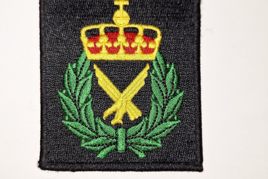 Fyrkantig tygmärke med broderat motiv. Märket har en svart bakgrund med en broderad guldfärgad krona med röda detaljer. Under kronan finns ett emblem omgivna av en grön lagerkrans.