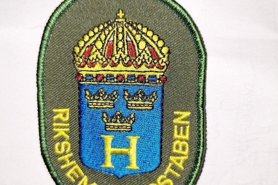 Broderad tygmärke med Rikshemvärnsstaben emblem. Märket har en grön bakgrund med en stiliserad krona och tre mindre kronor ovanför bokstaven H. Texten "RIKSHEMVÄRNSSTABEN" är broderad runt kanten.