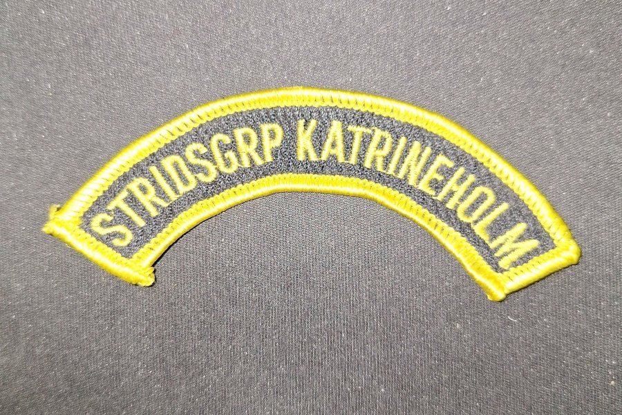 Broderad tygmärke med texten STRIDSGRP KATRINEHOLM i gult på svart bakgrund. Märket är format som en båge.