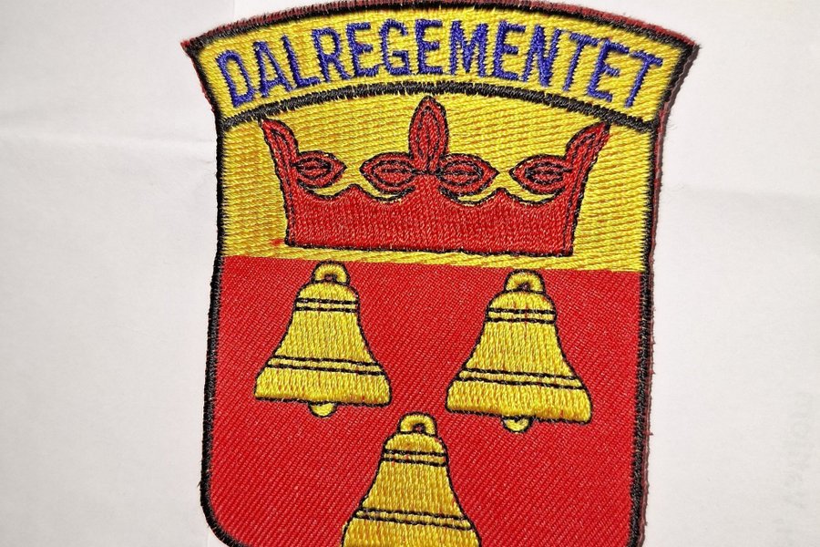Broderad tygmärke som föreställer Dalregementets vapen med tre bjällror och en krona.