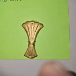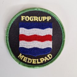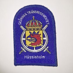 Broderad tygmärke med texten "STRIDSGRP KATRINEHOLM" i gult på svart bakgrund. Märket är böjt i en halvcirkelform och har en gul kant.