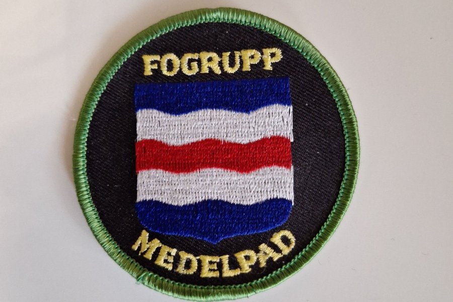 Rund tygmärke med texten "FOGRUPP MEDELPAD" broderad i gult. I mitten finns en sköld med vågiga ränder i blått, vitt och rött. Märket har en grön kant.