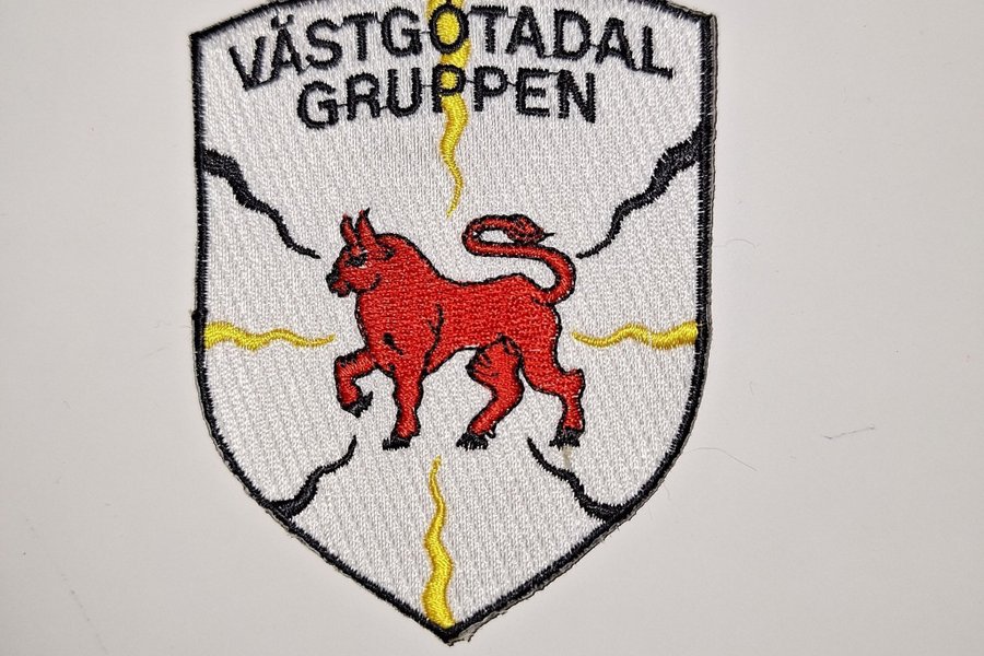 Västgötadal Gruppen tygmärke med en röd västgöta lejon på en vit sköld med svarta konturer och gula detaljer.
