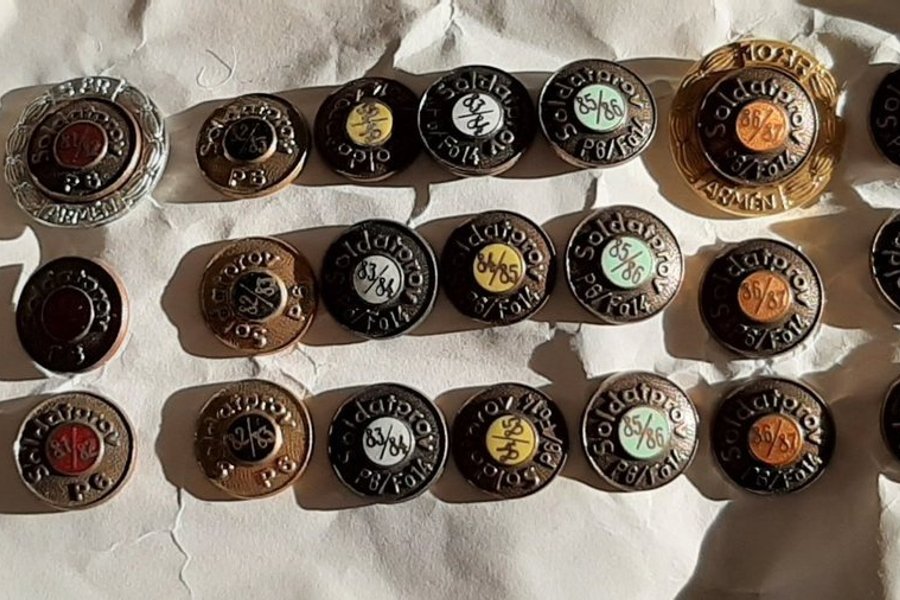 Parti soldatprov pins. Samtliga årtal från 1977- 1991/1992. 5-års, 10-års och 15-årsmärke.