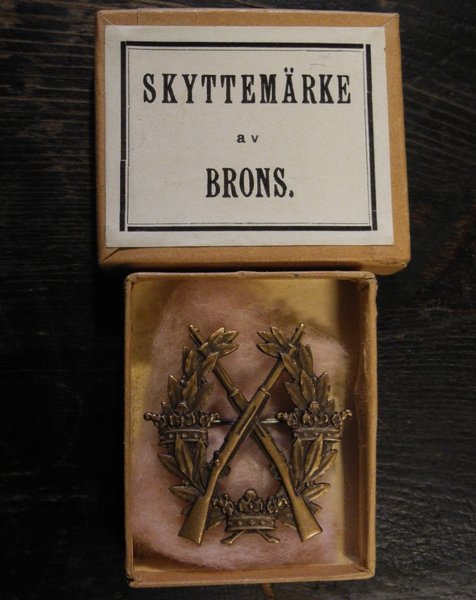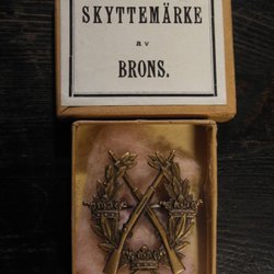 Skyttemärke av brons för frivilliga skytterörelsen i originalask från tidigt 1900-tal.