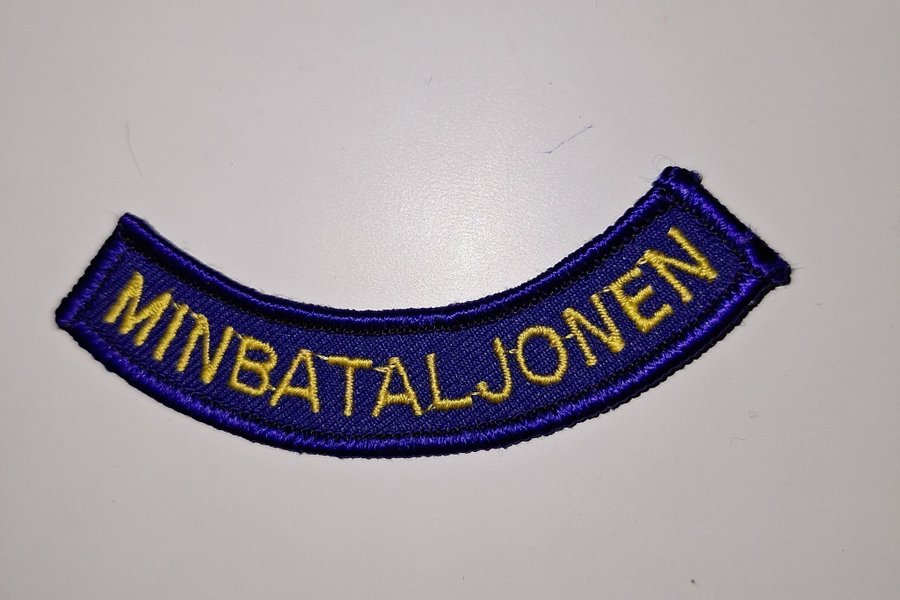 Detta är ett broderat tygmärke med texten "MINBATALJONEN" i gult på en mörkblå bakgrund. Märket är böjt och har en mörkblå kant.