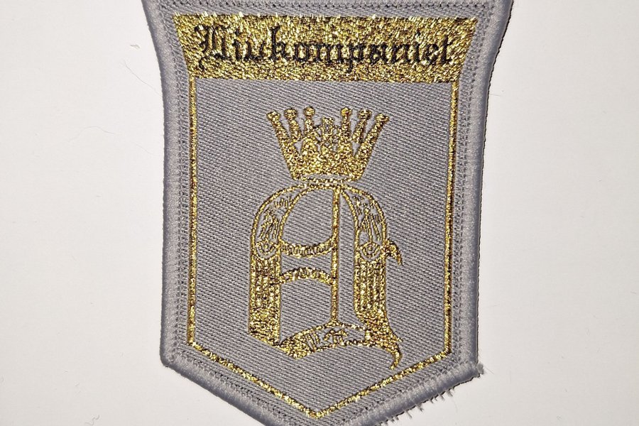 Broderad tygmärke med texten "Livkompaniet" och en krona ovanför ett stort "L". Märket har en grå bakgrund och guldfärgad brodyr.