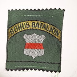 En broderad tygmärke med texten "BERPLUT" och ett vapen med en krona, ett lejon och korslagda vingar. Märket har en svart bakgrund och guldiga detaljer.