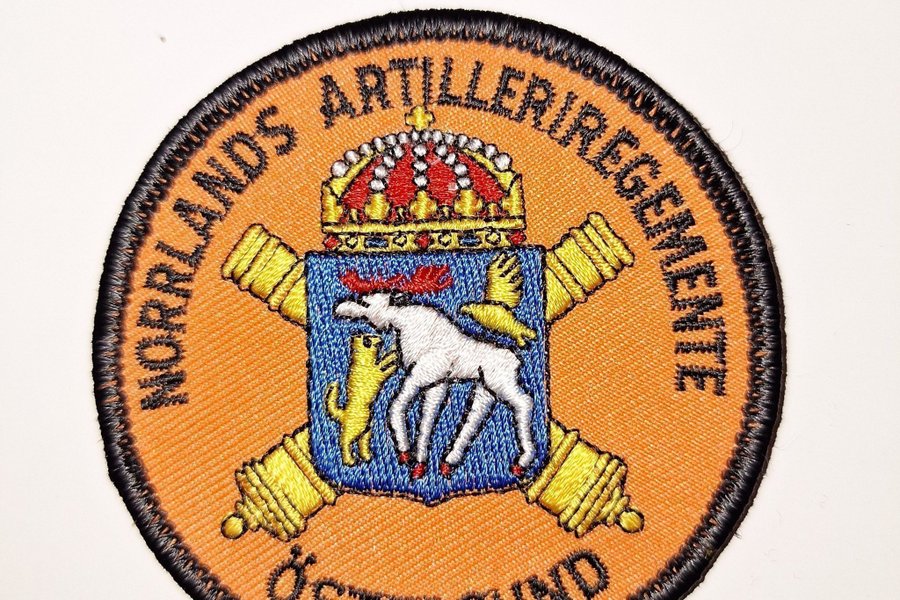 Broderad tygmärke med Norrlands Artilleriregemente Östersund vapensköld. Rund form med svart kant.