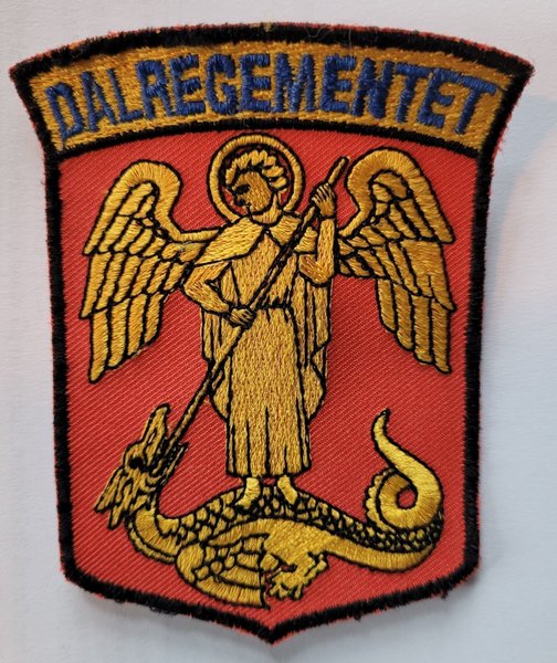 Ett broderat tygmärke med texten "DALREGEMENTET" och en bild av en bevingad figur som står på en drake.