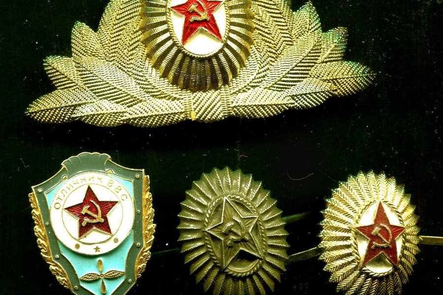 Tre mössmärken från Sovjet, därav en för officer samt ett utmärkelsetecken från det sovjetiska flygvapnet.