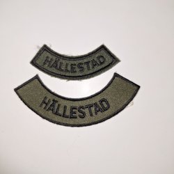 Broderad tygmärke med ett vapenmotiv bestående av en krona ovanför en sköld med korslagda kanoner och en flamma ovanför en våg.