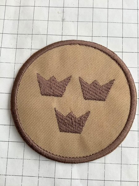 Ett ovalt märke med tre broderade kronor i brunt på en beige bakgrund. Märket har en brun kant runt om.