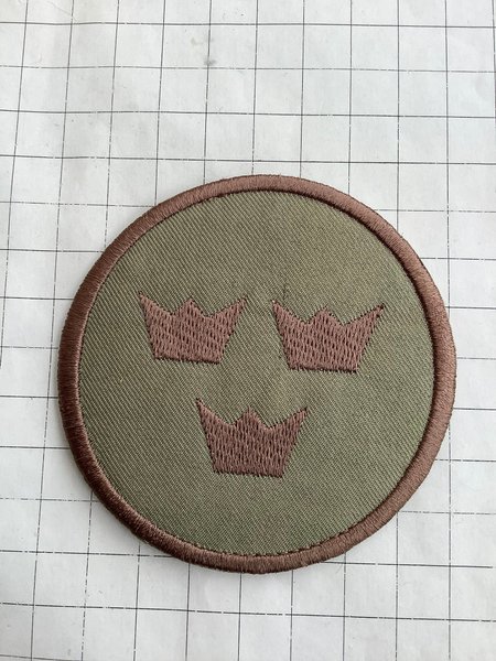 Ett ovalt tygmärke med tre broderade kronor i brunt på en olivgrön bakgrund. Märket har en broderad kant runt om.