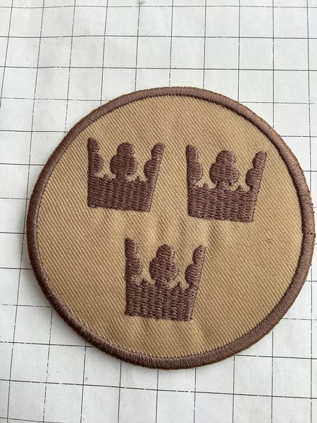 Ett ovalt tygmärke med broderade Tre Kronor i brunt på en beige bakgrund. Märket har en sydd kant runt om.