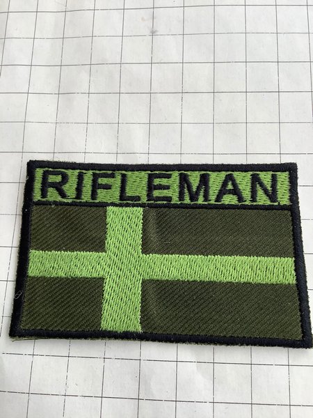 Ett märke med texten "RIFLEMAN" broderad i svart på en ljusgrön bakgrund. Under texten finns ett kors i ljusgrönt på en mörkgrön bakgrund. Märket har en svart kant runt om.