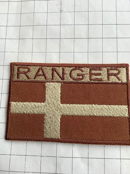 Ett broderat märke med texten "RANGER" överst och en flagga undertill. Flaggan har ett korsmönster i beige på en brun bakgrund. Märket har en broderad kant runt om.
