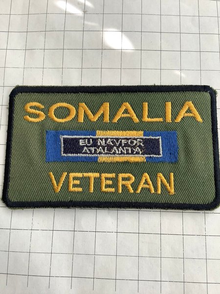 Ett märke med texten "SOMALIA EU NAVFOR ATALANTA VETERAN" broderad i gult och vitt på en grön bakgrund med en blå rand. Märket har en svart kant.