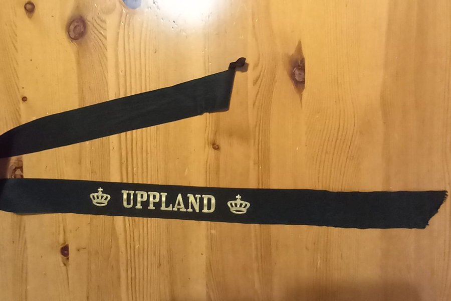 Ett svart pannband med texten Uppland tryckt i guld färg, samt en krona på vardera sida om texten.