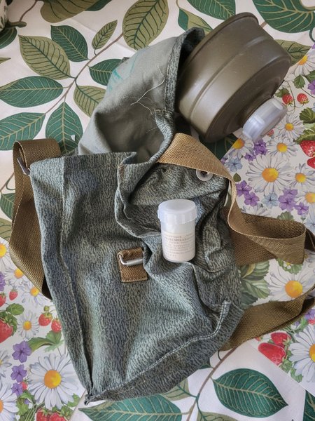 Väska med gasmaskfilter och en liten behållare med något i. Kanske polsk.