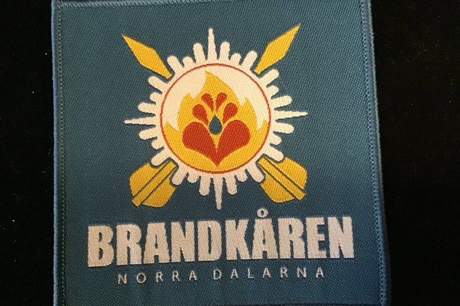 En fyrkantig tygmärke med texten "BRANDKÅREN NORRA DALARNA" broderat nedtill. Ovanför texten finns en stiliserad symbol med en eldsflamma omgiven av en sol och två korslagda yxor.
