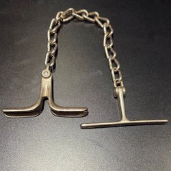 Handfängsel svarta med viss patina, bojnyckel, fodral i kraftigt tyg, med tryckknapp och kardborreband. Fungerar utan anmärkning.