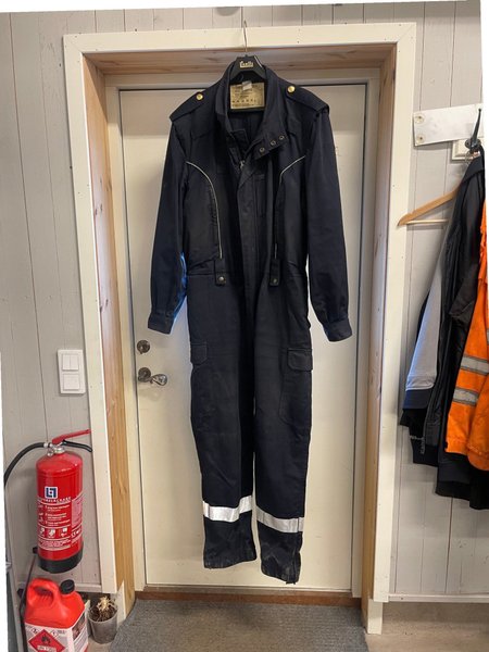 Overall med dragkedja framtill. Den har flera fickor, inklusive bröstfickor och benfickor. Midjan är justerbar med resår. Ärmslut och benslut har reflexband.