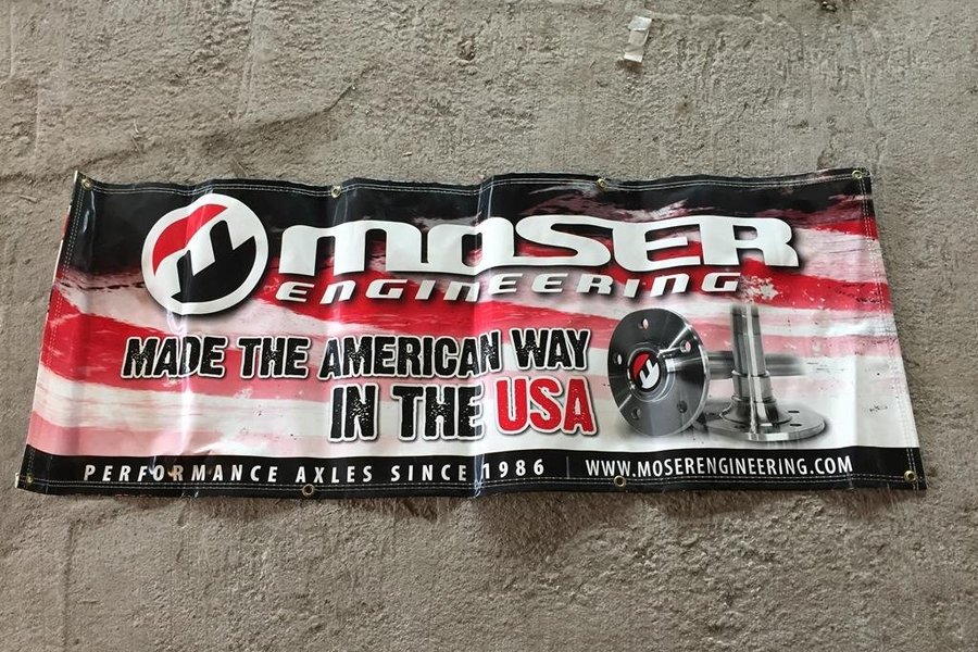 Moser Engineering reklambanderoll med metallöglor, 150x58 cm. Utmärkt prydnad till garageväggen!