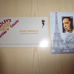 Elvis Presley memorabilier. Till exempel 2 st. A4 poster, frimärken och 11 cm x 15 cm fotografier.