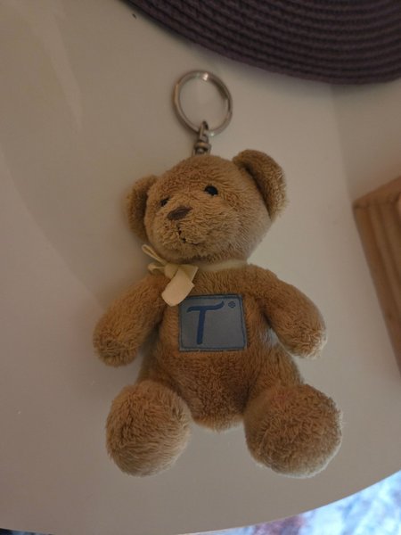 En söt teddybjörn som kan användas som en nyckelring. Den har en liten rosett runt halsen och en blå lapp med ett "T" på magen.