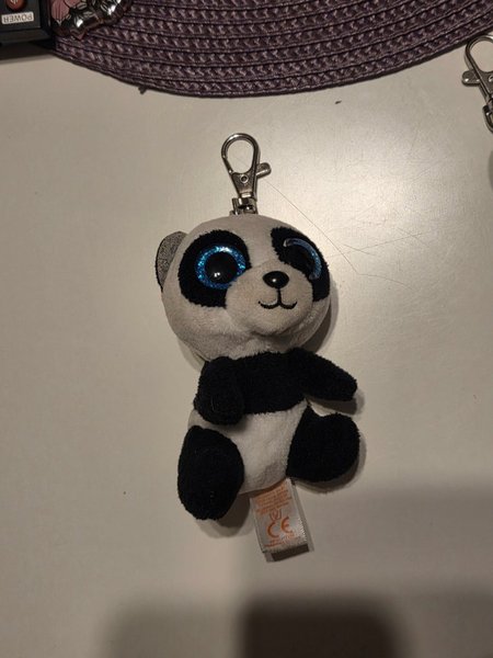 Nyckelring i form av en panda. Pandan är svart och vit med glittriga blå ögon. Den har en metallklämma för att fästas på nycklar eller väskor.