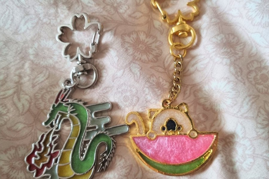 Nyckelringar föreställande en drake och en katt med en vattenmelon. Har stått i bokhylla. OBS! Lite grönt saknas på nyckelringen med katten, se bild.