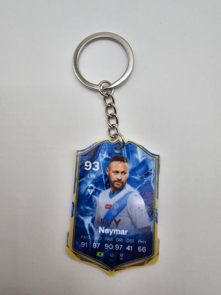 Nyckelring med Neymar-motiv. Föreställer Neymar i en fotbollskortsliknande design med siffran 93 och texten "LW". Kortet visar även statistik som PAC 91, SHO 87, PAS 90, DRI 97, DEF 41, PHY 66.