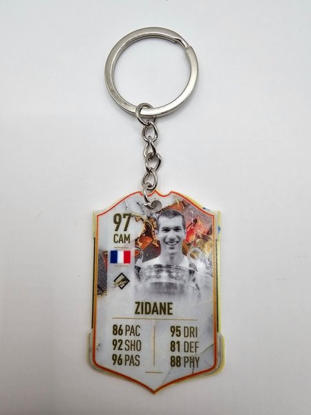 Nyckelring med en bild av fotbollsspelaren Zidane. Nyckelringen är formad som ett fotbollskort med Zidanes namn, nationalitet (Frankrike) och statistik: 97 CAM, 86 PAC, 92 SHO, 96 PAS, 95 DRI, 81 DEF, 88 PHY.