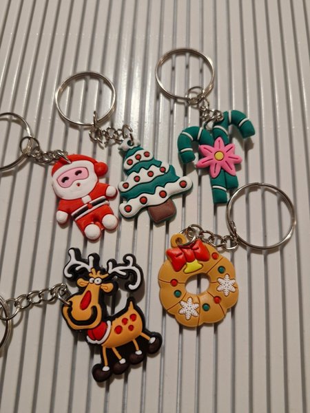 Ett set med fem juliga nyckelringar. Inkluderar en jultomte, en julgran, en polkagris, en julkrans och ett ren.