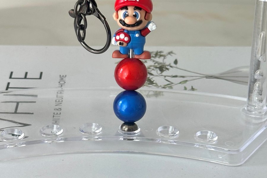 Nyckelring med Super Mario-figur. Mario håller i en röd svamp. Nyckelringen har även två pärlor i rött och blått.