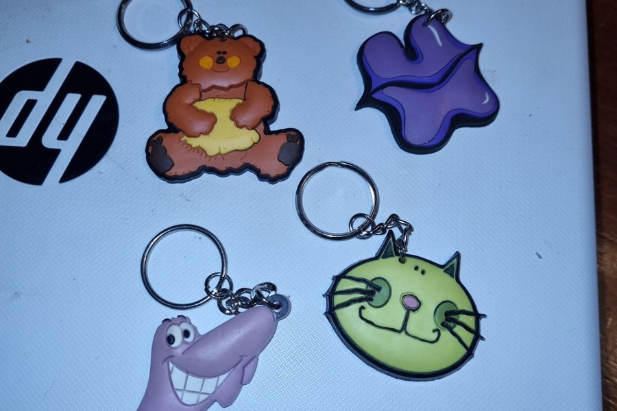 Ett set med fyra olika nyckelringar. Innehåller en nallebjörn, en lila abstrakt form, en grön kattansikte och en rosa figur med ett stort leende. Se bild